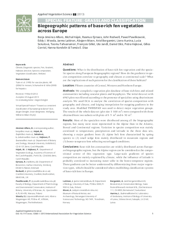 Pdf Biogeographic Patterns Of Base Rich Fen Vegetation Across Europe P Pawlikowski Liene Aunina Francois Gillet Hanna Kondelin And R Ejrnaes Academia Edu