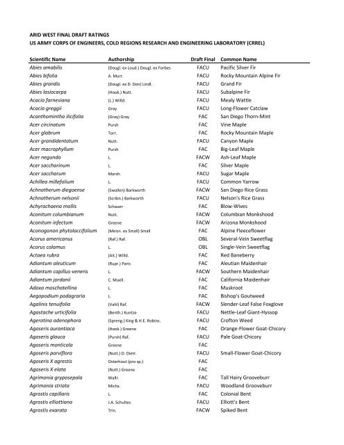 National Wetland Plant List Nwpl For The Arid West U S Army